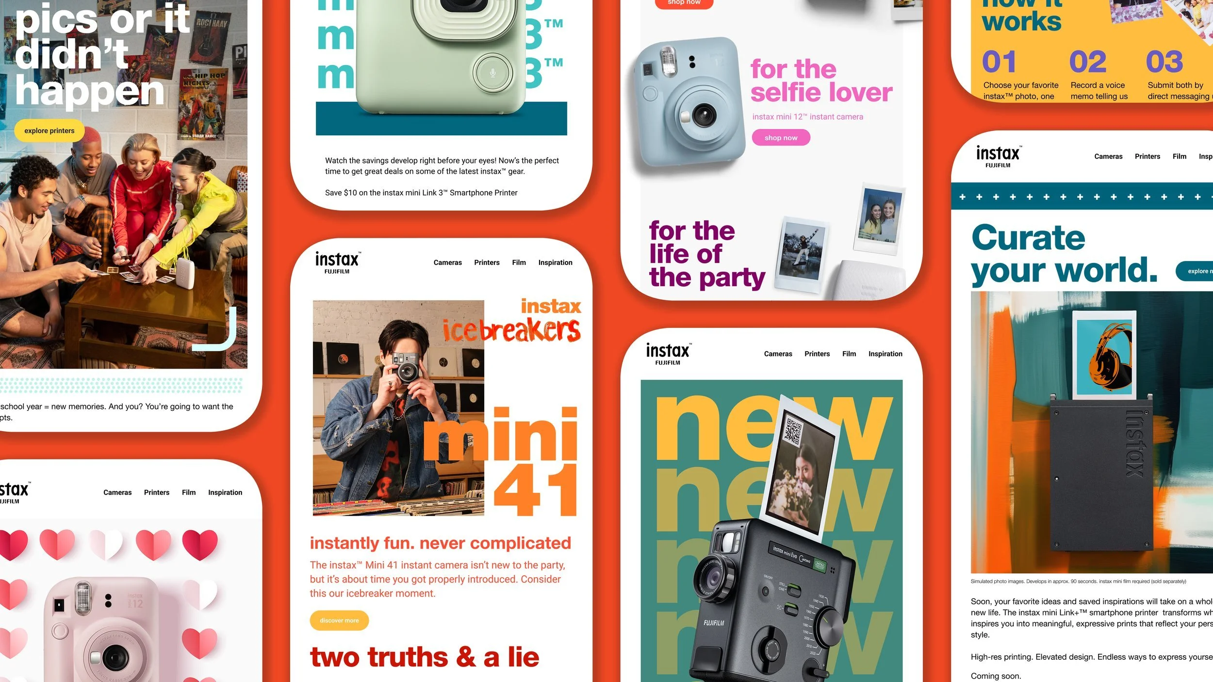 The work centered on establishing a clear creative point of view for email, aligning design and messaging with the INSTAX brand, and creating a program that was planned, repeatable, and trusted by the business, leading to a 32% increase in open rates, year over year, and a 234% increase in click-to-open rates.
